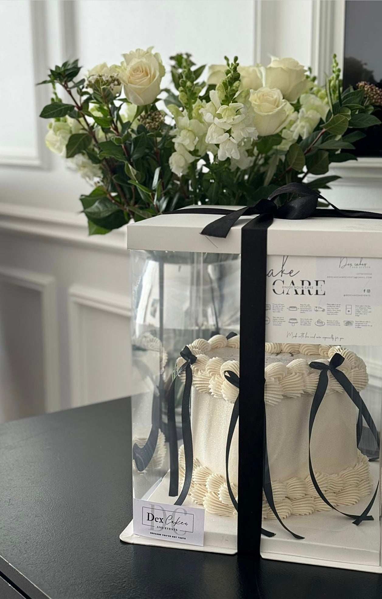 Elegant buttercream burnaway cake with ribbons and a calendar topper—perfect for nostalgic celebrations.