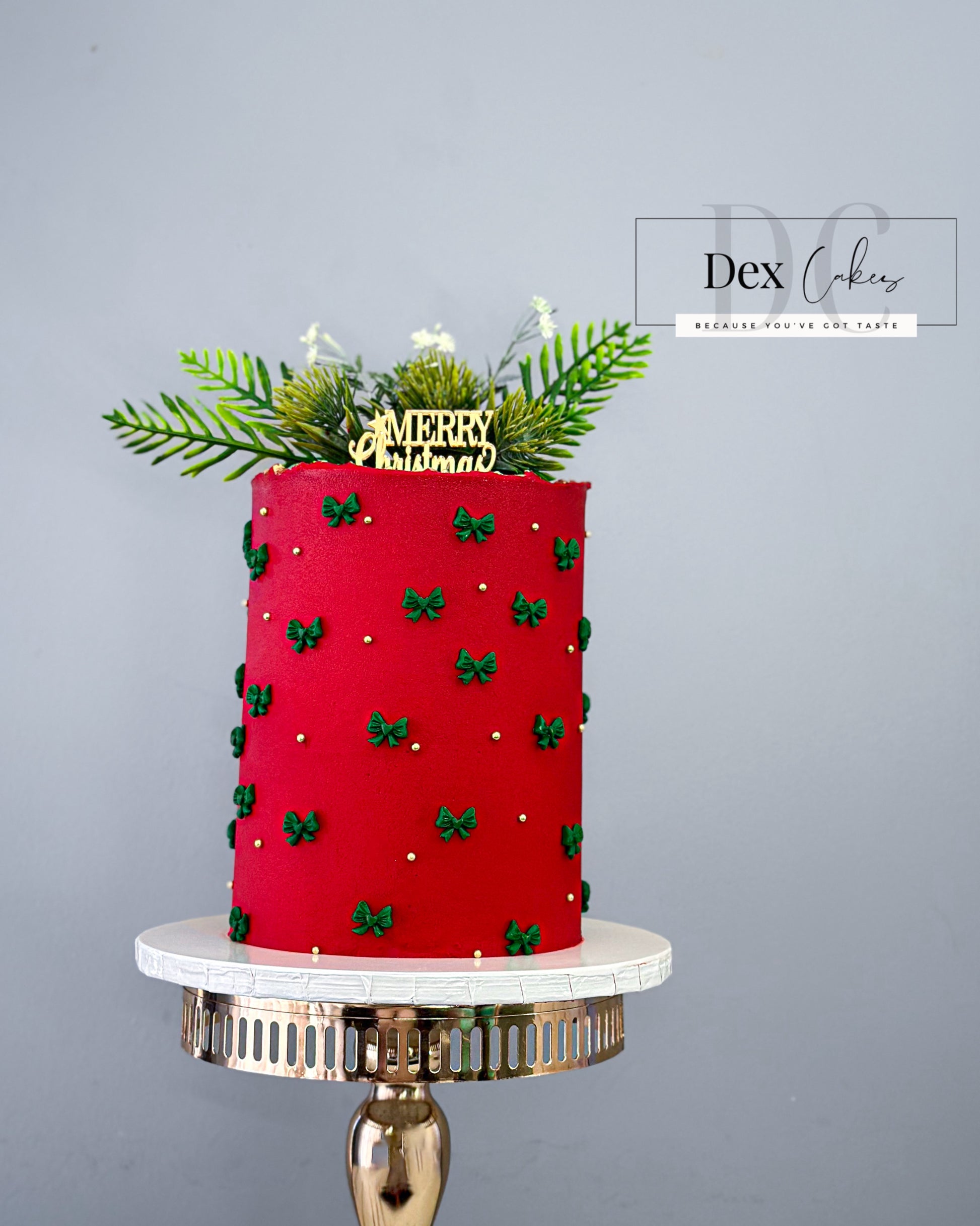 A bold red Christmas cake decorated with green bows and festive charm β perfect for your holiday celebrations. πβ¨