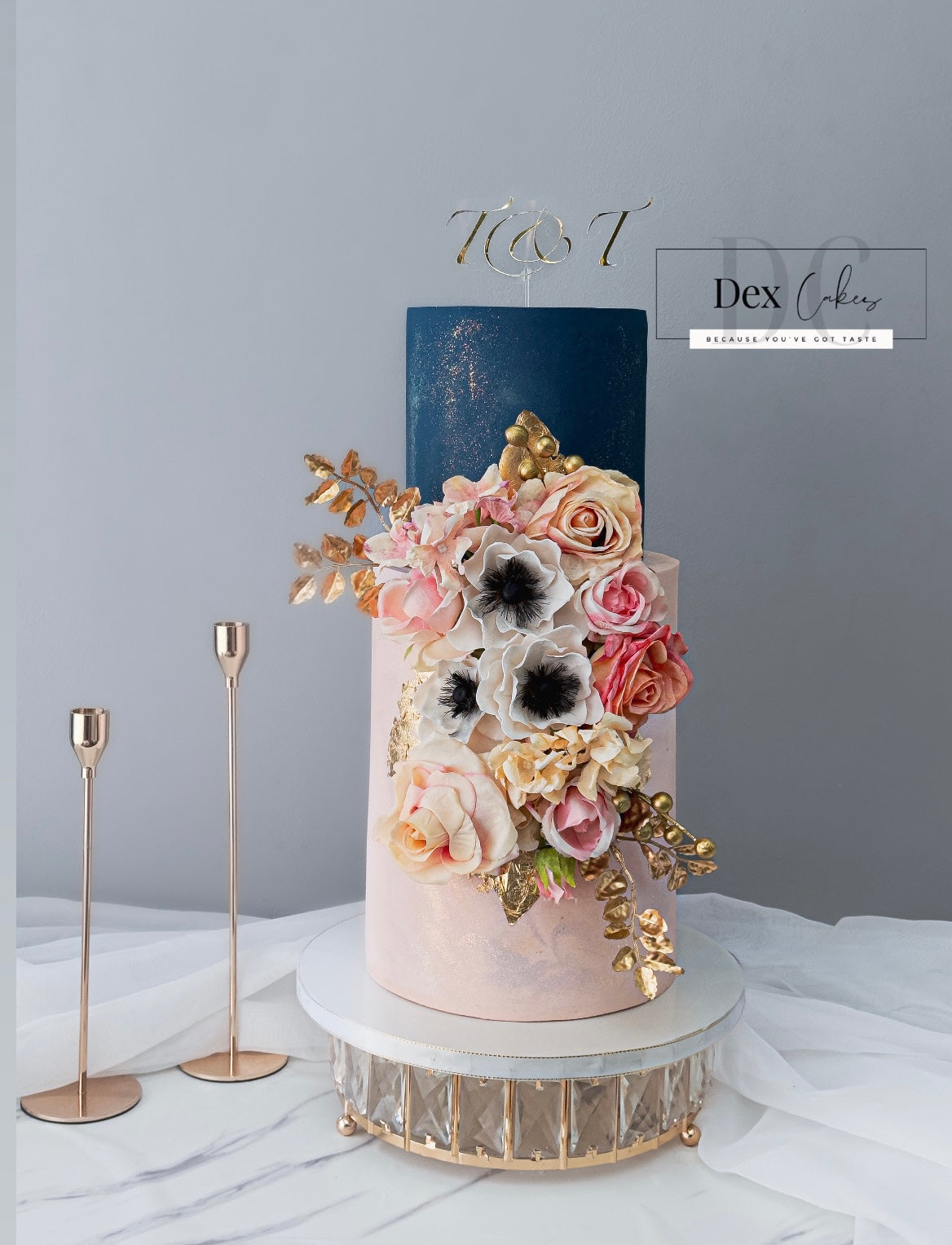 A captivating fusion of soft pink and deep blue, crowned with a lush cascade of gold, white, and pink blooms. Each cake is uniquely handcrafted, ensuring no two are ever identical—a true centerpiece for your celebration. Design may vary slightly for a one-of-a-kind masterpiece.